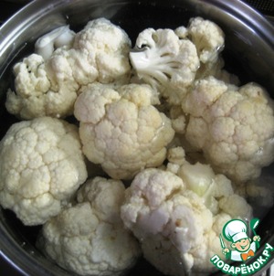Цветную капусту разобрать на крупные соцветия. Положить в кастрюлю с водой, дать закипеть, через 3-4 минуты снять кастрюлю с огня, воду слить.
