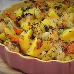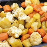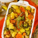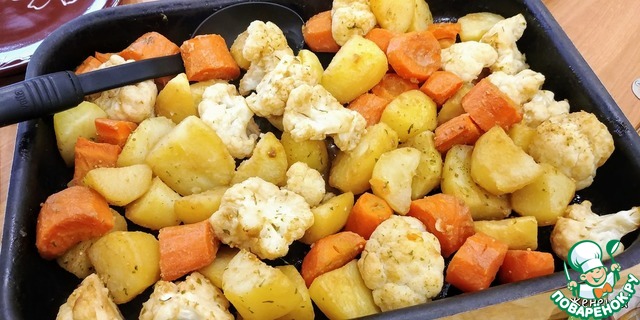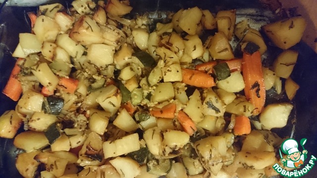 Отправить в разогретую до 200 градусов духовку на 40-45 минут. За это время овощи несколько раз аккуратно перемешать, доставая форму из духовки.