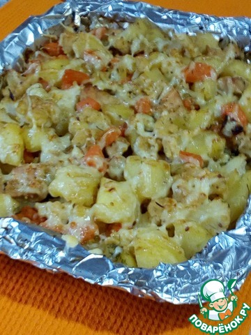 Выложить в форму для запекания овощи, равномерно полить медово-горчичной заливкой, аккуратно перемешать.