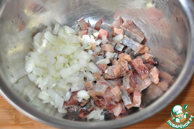 Копчёную сельдь чистим, разделываем на филе и режем мелкими кубиками. Лук чистим и также режем мелкими кубиками.