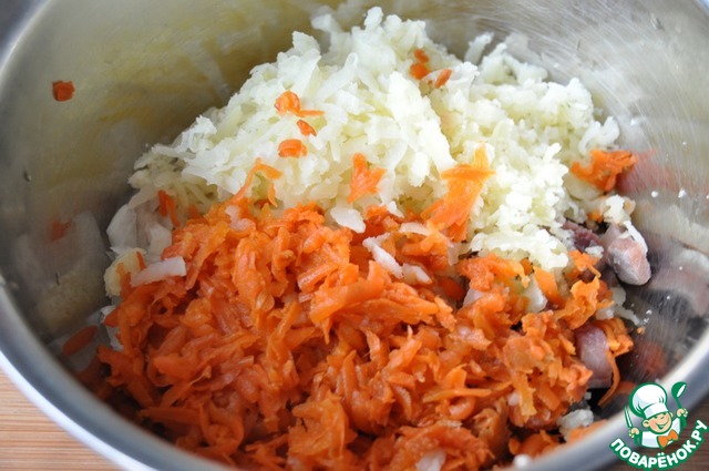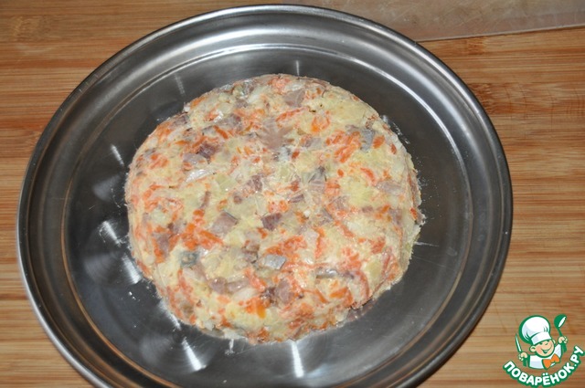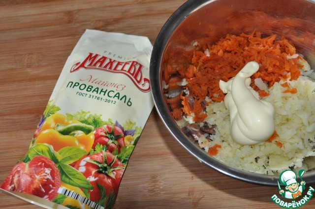 Соединяем лук, сельдь, картофель и морковь, добавляем майонез, у меня "Провансаль", от "МахеевЪ". Перемешиваем.