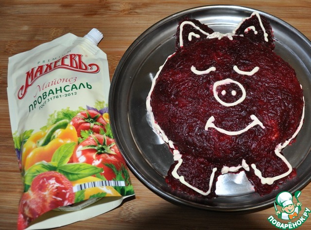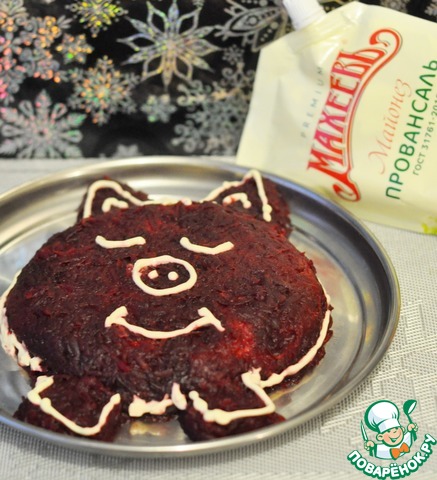Этот рецепт можно изложить в двух словах: "Сделать "селёдку под шубой", придать ей нужную форму и нарисовать майонезом свиное рыло".