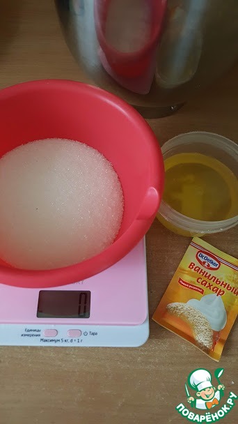 Отмерить нужное количество сахара, та же добавить к нему ванильный сахар. -