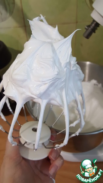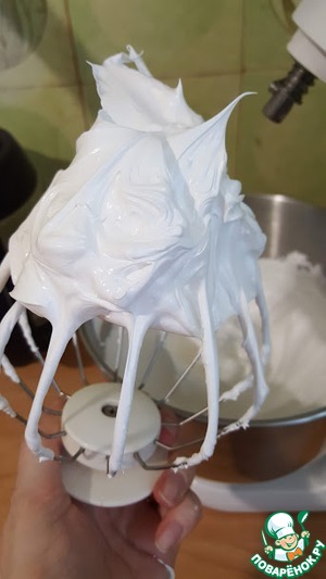 Далее эту массу нужно взбить до плотных, крепких пиков. Если это ручной миксер, то времени на взбивание понадобится больше, чем для стационарного. Я взбивала около 15 минут. Масса на венчике стоит "колом" и никуда не опадает.