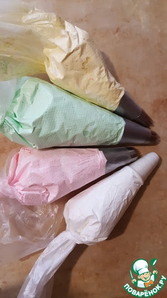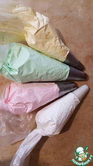 Далее нужно разложить по кондитерским мешкам, с насадками. -