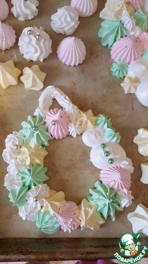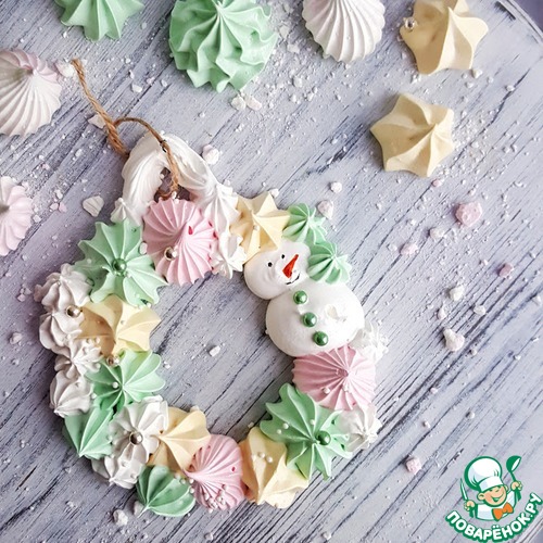 Ура! Скоро Новый год - волшебный праздник! Многие люди жалуются, что у них нет новогоднего настроения, но проблема в том, а точнее решение этой проблемы - это настроение нужно создать себе самим!:) Например, уркасить квартиру новогодней атрибутикой) А если это сделать своими руками (украшения, я имею ввиду ;)), что скажете? Предлагаю сделать оригинальное украшение на ёлку! Венок из безе) Делается легко и просто! А в конце праздников еще и съесть можно;) С наступающим праздником, друзья!