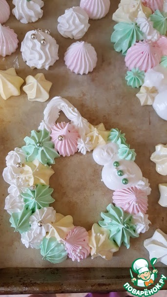 Отсадить безе по кругу, в форме венка. Не забудьте сделать петельку сверху, чтобы можно было прикрепить веревочку)