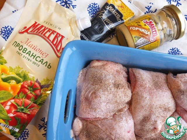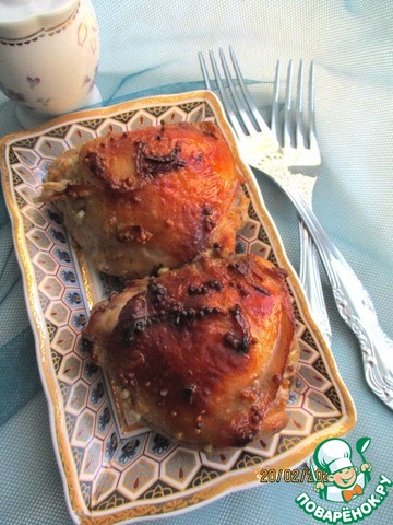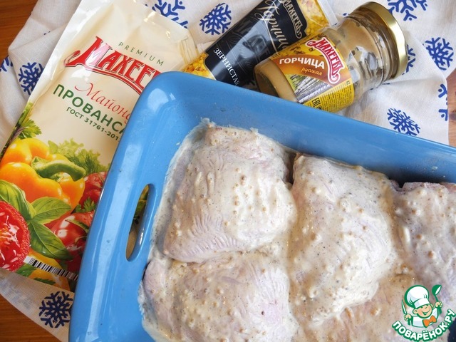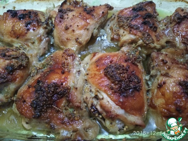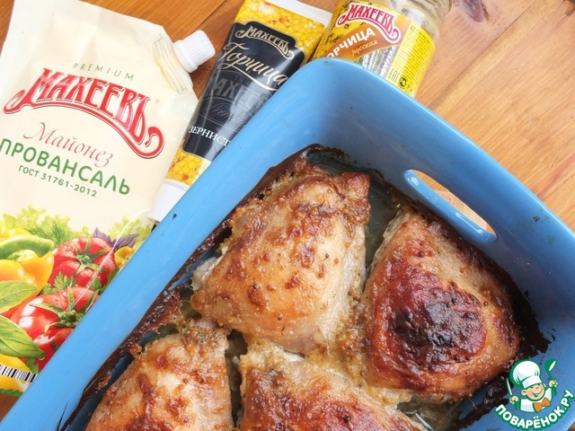 При подготовке праздничного новогоднего стола большое внимание уделяется закускам и салатам. Горячие блюда, а тем более, гарниры отходят на второй план, и до них редко доходит дело после сытного «Оливье» или «Мимозы» (по крайней мере, в моей семье это так). Да и тратить время на приготовление горячих блюд попросту жалко, поэтому самый оптимальный вариант — это запечь горячее в духовке. Предлагаю вам простой, быстрый вариант вкусной запеченной курицы! Курица получается нежной, ароматной, с пикантным чесночно-горчичным вкусом!
