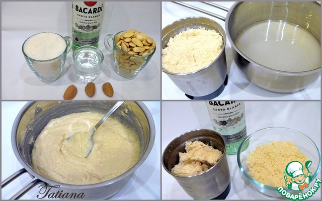В небольшой кастрюльке сварите сироп из сахара и воды (варите на медленном нагреве, постоянно помешивая, не допуская кристаллизации сахара). В горячий сироп выложите измельченный миндаль, варите смесь минуты 3-4 (!!! не допустите пожелтения миндальной смеси), постоянно помешивая (вид манной каши). Смесь будет побулькивать "пузырями".