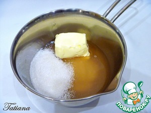 В небольшую кастрюльку поместите мёд, сахар и сливочное масло.