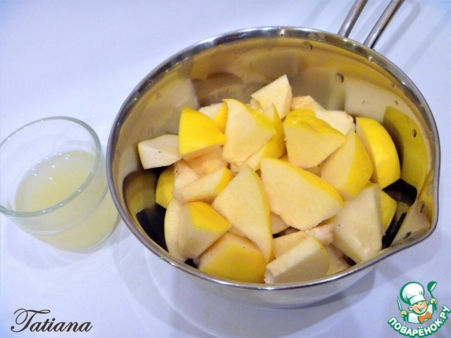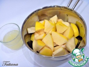 Айву хорошо вымойте, произвольно порежьте в небольшую кастрюльку (удали те семенную коробку), влейте фруктовый сок (воду)со щепоткой лимонной кислоты. Варите айву под крышкой на медленном нагреве до размягчения, минут 20-25.