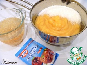Готовую айву измельчите блендером, протрите через сито. Пюре взвесьте, добавьте сахар (20% от веса готового пюре, в моём случае на 400 г. пюре+80 г. сахара). Замочите желатин в 100 мл. воды. Набухший желатин распустите в микро (60%=1 минута), смешайте желатин с айвовым
