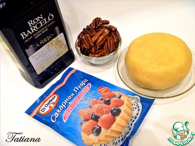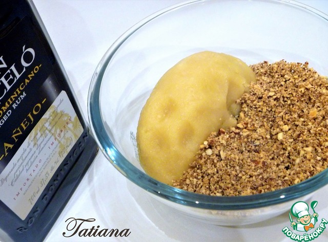 Орехи (пекан или грецкие) измельчите в среднюю крошку. Смешайте измельченные орехи с марципаном (при необходимости добавляйте любую жидкость-ром, сок, воду)в плотный ком (принцип замеса песочного теста), заверните в пленку, уберите в холодильник, на пару часов.