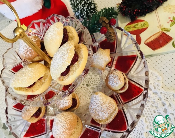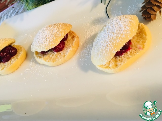 Пышные, нежные, на два укуса, которые выпекают в духовке. Вырезать можно формочками красивыми, украсить сахарной пудрой, заполнить любимым джемом. Я вложила вишню консервированную.