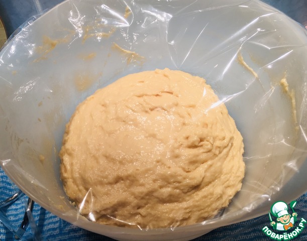 Накрыть пищевой плёнкой, дать тесту подняться при комнатной температуре на 30 минут.
