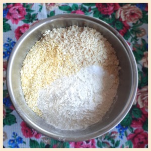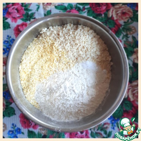 В отдельной посуде смешать пшенные хлопья, муку, соль, соду, тертый арахис. У меня арахис был в форме лепесков и я их перетерла руками. Если у вас целые орехи, тогда их надо измельчить.