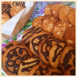 Часть печенья я украсила шоколадом. В пакетик положила 50 г. шоколада и поместила его в миску с горячей водой. После того как шоколад расплавился, отрезала уголок пакетика и нарисовала на печенье узор.