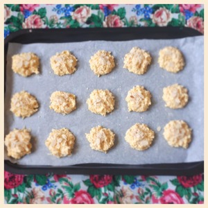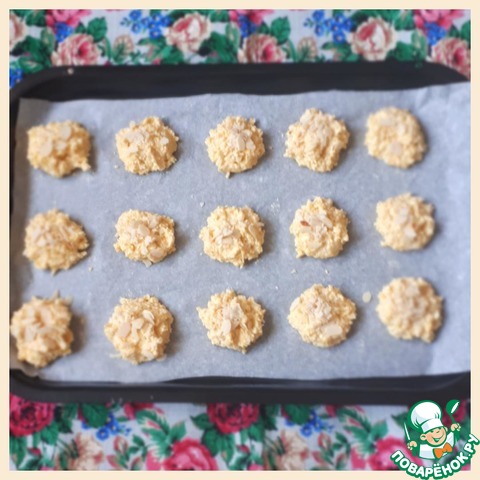 Противень выстлать пергаментом и чайной ложкой выложить печенья, оставляя расстояние между ними, так как печеньки растекаются во время выпечки. Сверху печенье посыпать ореховой стружкой. Выпекать в духовке при температуре 180 градусов до золотистого цвета.