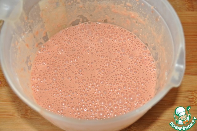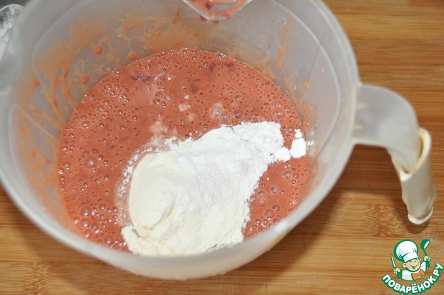 Добавляем молоко, крахмал, муку и разрыхлитель. Всё пробиваем блендером до однородности.