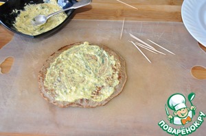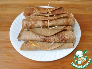 Сворачиваем блинчик в рулетик и скрепляем зубочисткой.