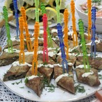 На готовые рулетики для подачи сверху наносим полосочки майонеза, у меня "Провансаль" от "МахеевЪ".