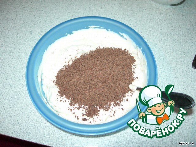 Пока печется в разогретой духовке основа (до сухой палочки), мы дробим слегка подсушенные орехи, взбиваем сливки с сахаром и загустителем для сливок, трем на средней терке 1/3 плитки шоколада.