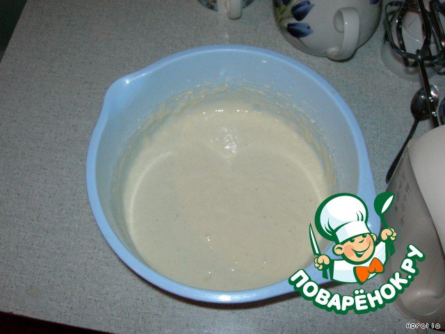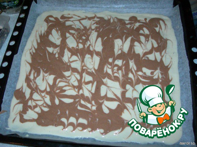 Выливаем тесто на противень, застеленный бумагой и смазанный маргарином или сливочным маслом. Оставивляем немного теста, чтобы добавить туда какао (1 ст. л.). Эти "темные остатки" теста хаотично выливаем на противень, можно поводить еще и зубочисткой, сделав небольшие разводы.