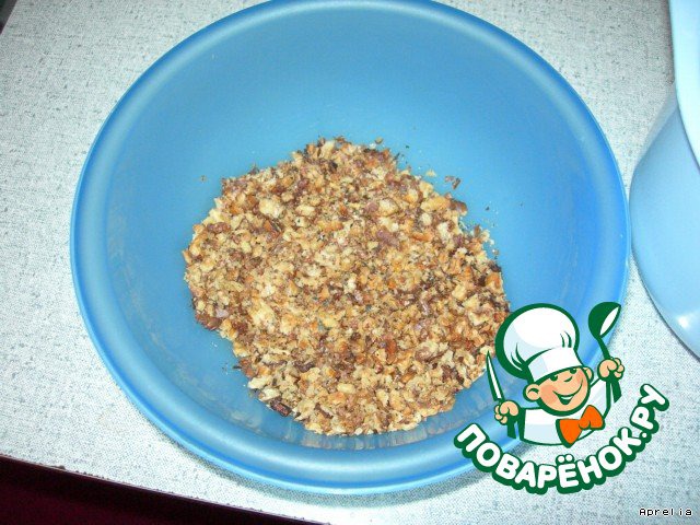 Замешиваем тесто: взбиваем в миске все ингридиенты для основы. Пока мы это делаем - в духовке слегка подсушиваем грецкие орехи для начинки (не теряем время).