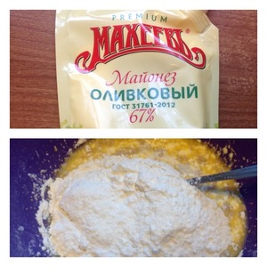 В теплое молоко добавить сахар и дрожжи, перемешать. Масло растопить и немного остудить, добавить к молоку. Так де добавить майонез и перемешать.