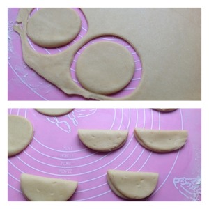 Подошедшее тесто обмять. Если потребуется, стол подпылить мукой и раскатать тесто толщиной 2 мм. Вырезать кружки из теста примерно в диаметре 7 см. Каждый кружок сложить пополам.