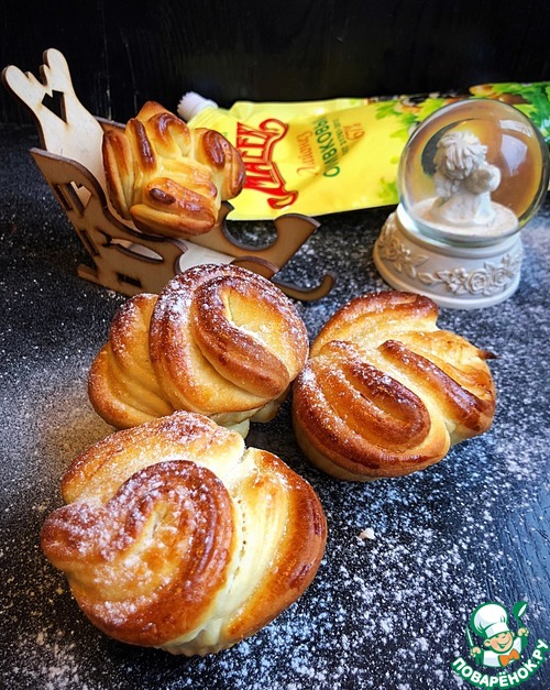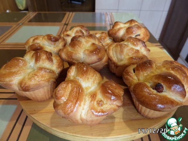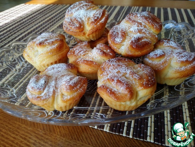 Сложить еще раз пополам. Заготовки по 3 штучки выложить в силиконовые формы для кексов. Дать расстояться минут 20. Смазать булочки взбитым яйцом, и отправить булочки в духовку при 180 гр до готовности. Готовые булочки вытащить из формочек и присыпать сахарной пудрой.