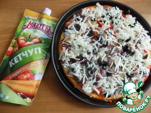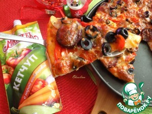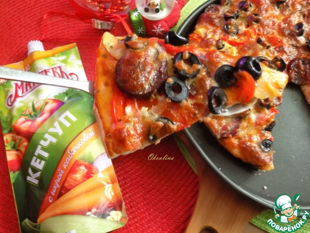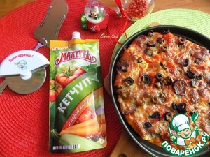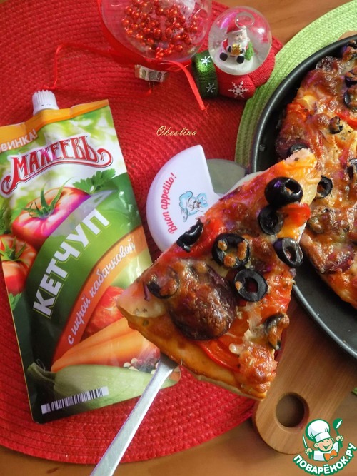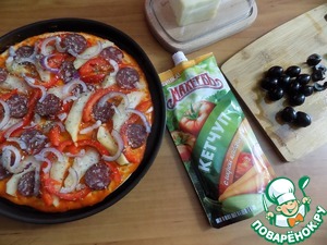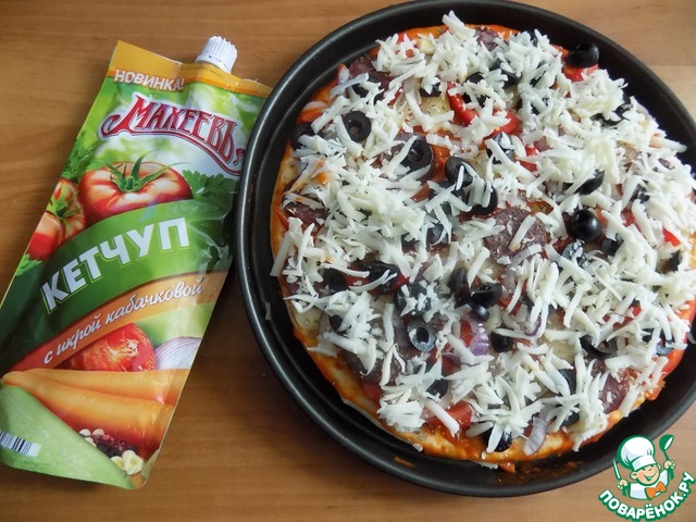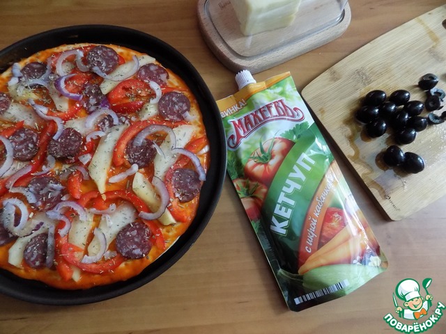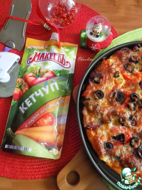 Я купила в магазине кетчуп ТМ МахеевЪ с кабачковой икрой. Была приятно удивлена вкусу этого кетчупа и решила, что я сделаю кабачковую пиццу с колбасой. Кстати, я впервые увидела этот продукт! Здесь я много выставляла пиццы и о тесте писать не буду, а дам ссылку своего теста, которое я всегда использую в последнее время для приготовления домашней пиццы. Вот: https://www.povareno k.ru/recipes/show/15 1965/ В рецепте я больше скажу об ингредиентах, которые я использовала для пиццы.