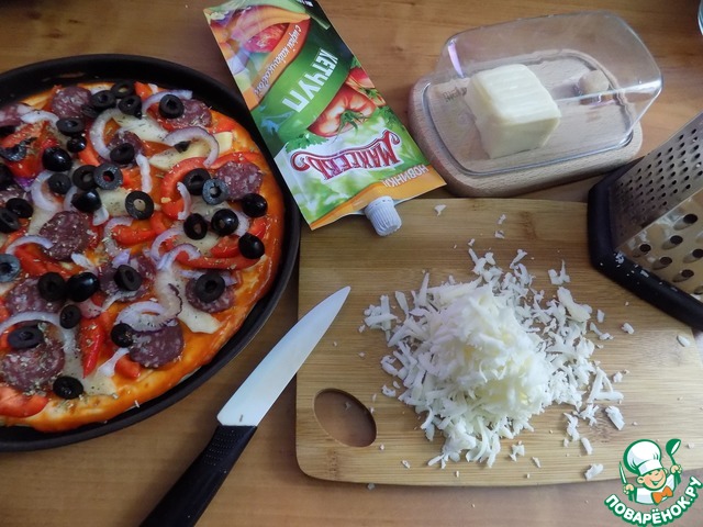 Для пиццы берите тесто, которое вы всегда используете или сделайте моё, рецепт которого я давно нашла на сайте "Моцарелла" в Фейсбуке. С тех пор я им постоянно и пользуюсь. Я много здесь выставляла пиццы и вот ссылочка:https://www .povarenok.ru/recipe s/show/151965/