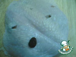 • Курицу промыть, по желанию можно нарезать, а можно запечь целеком. Проколоть курицу острым ножом, сформировав тем самым как можно больше небольших отверстий.