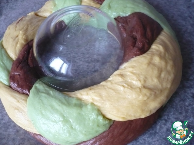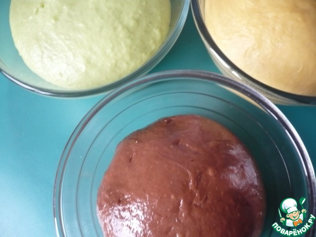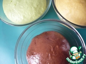 Разделить тесто на три равные части. В каждую добавить натуральный краситель: в первую часть теста — растворенное в молоке какао, во вторую — зеленую глазурь, в третью часть — тыквенное пюре. Каждую часть теста хорошо замесить, пока оно не станет однородным и упругим. Все три части теста, сформируйте в шары и положите в отдельные миски. Накройте салфеткой и оставите подниматься в течении 2-х часов в теплом месте.