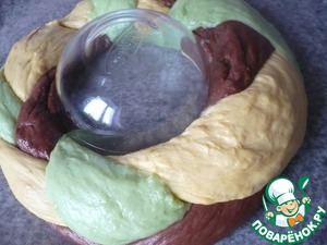 Затем красочные жгутики теста заплетите в косу и положите на противень, застеленный пергаментной бумагой, посередине поставьте миску и вокруг неё образуйте из косы круг. Слепите концы косы друг с другом. Накройте противень с выпечкой салфеткой и дайте подняться тесту 30-40 минут.