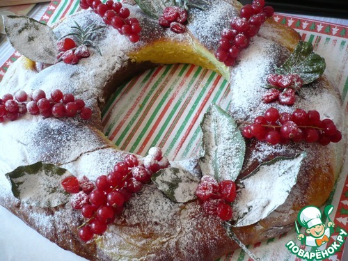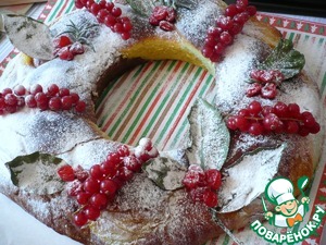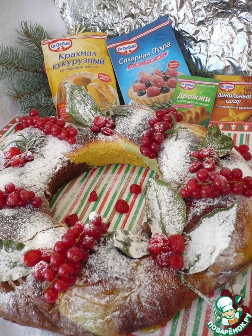 Готовый рождественский венок остудите и посыпьте сахарной пудрой ТМ Dr. Oetker смешанной с небольшим количеством кукурузного крахмала ТМ Dr. Oetker. Украсьте веточками красной смородины и сушеной вишни.