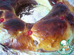 Разогрейте духовку до 170 градусов. Поднявшийся за это время венок смажьте яйцом и поставьте в духовку. Выпекайте 30 минут.