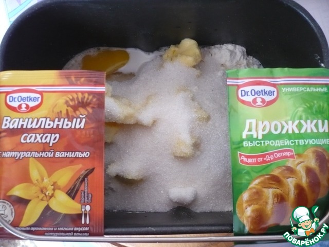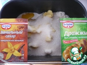 Тесто я замешиваю, с помощью хлебопечки. В ведерко хлебопечки наливаю теплое молоко, вбиваю куриные яйца, добавляю просеянную муку, сахар, ванильный сахар с натуральной ванилью ТМ Dr. Oetker, соль, размягченное сливочное масло и дрожжи быстродействующие ТМ Dr. Oetker.