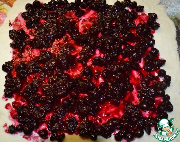 Раскатать тесто на припыленой мукой доске. Я люблю потоньше, поэтому у меня где-то 3-4 мм. Нанести начинку не доходя по 1см с каждой стороны. Свернуть рулетом и разрезать на части. Я сделала 6 рулетиков.