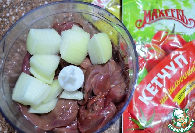 Говяжий фарш, печень и лук измельчить в блендере.