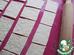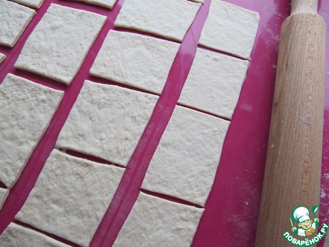 Тесто частями раскатать на припыленной мукой поверхности до толщины около 3мм, поделить на квадраты 10х10см.