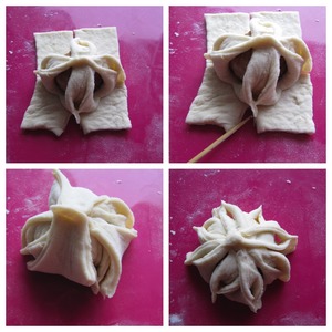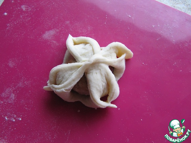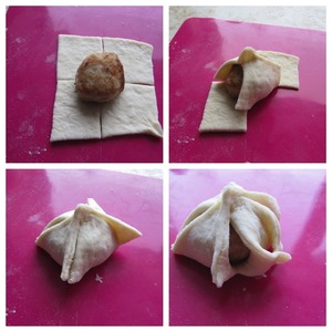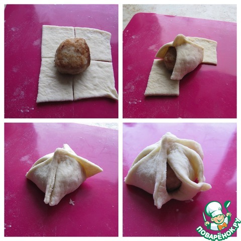 Каждую сторону квадрата надрезать к центру на 2-3см. На середину выложить котлетку, соединить поочередно края как указано на фото.
