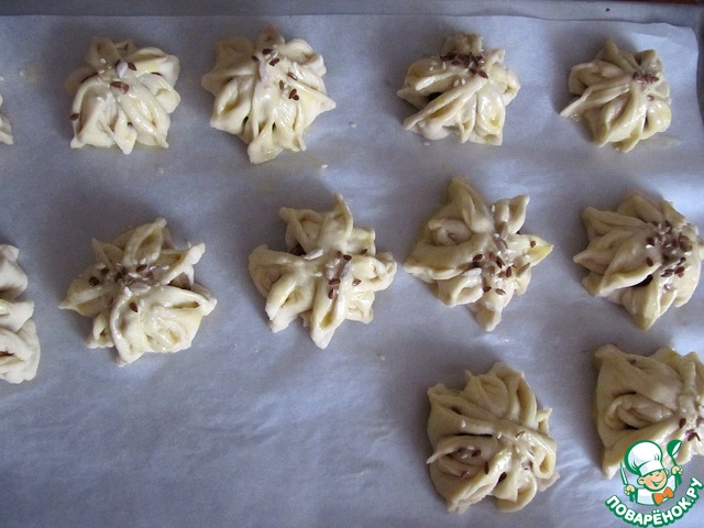 Подготовленные заготовки выложить на противень, застеленный бумагой для выпечки, смазать желтком, по желанию верх присыпать семечками. Выпекать в разогретой до 180 С духовке в течение 20 минут (ориентировочно) до готовности.