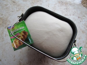 Для приготовления теста дрожжи развести в теплой воде, добавить сахар, 3 ст л муки, перемешать, оставить на 10 минут. Затем в ведерко ХП высыпать муку, добавить 2 ст. л растительно масла, соль, разрыхлитель теста, разведенные дрожжи, готовить в режиме "Тесто".