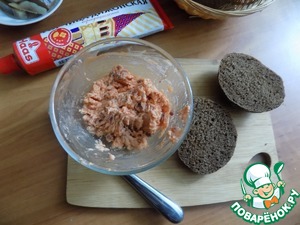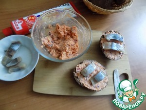 Намазала булочки бородинские слоем намазки. Толстым слоем не следует мазать, хотя это на ваш вкус, и кладём сверху филе сельди. Ставим на минут 10 в холодильник, чтобы масло немного схватилось.