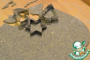 Тесто очень мягкое, нежное. Раскатать тесто и вырезать при помощи формочек любые новогодние фигуры. -