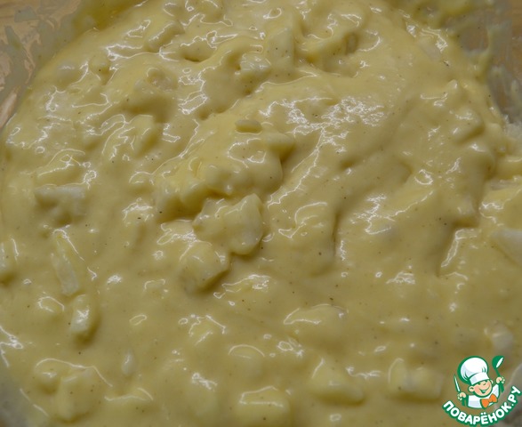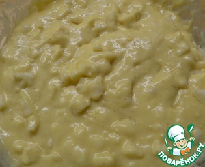 Смешать жидкие смеси, всыпать муку. Должно получится темто как на оладьи.