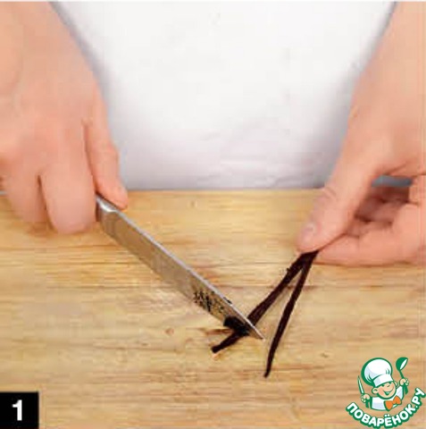 Залейте 1,5 ч. л. желатина 3 ст. л. сливок и оставьте на 10 мин. Разрежьте стручок ванили вдоль пополам и выскребите семена. Положите оставшиеся сливки, 50 г сахара и семена ванили в сотейник и подогрейте, но не кипятите.