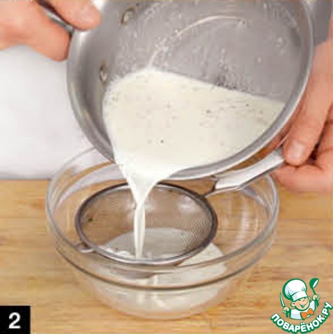 Влейте горячие сливки в желатин и размешайте. Желатин должен полностью раствориться. Процедите смесь через сито. Поставьте силиконовую форму на поднос. Форму до половины заполните сливочной смесью. Остудите и поставьте в холодильник на 2 часа. Желе должно почти полностью застыть.